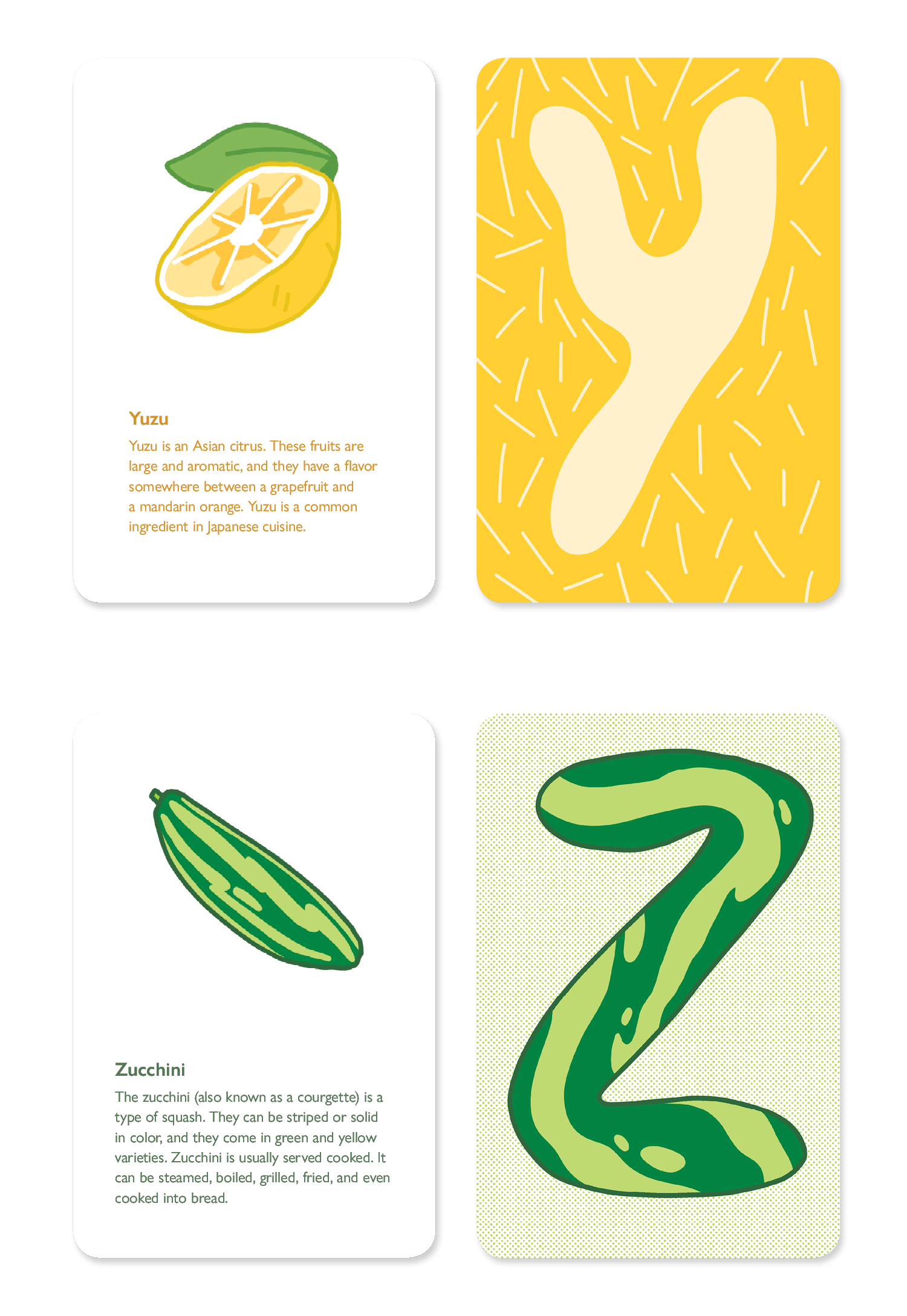 For this personal project, I set out to create a set of alphabet flashcards for children based on fruit from A-Z.